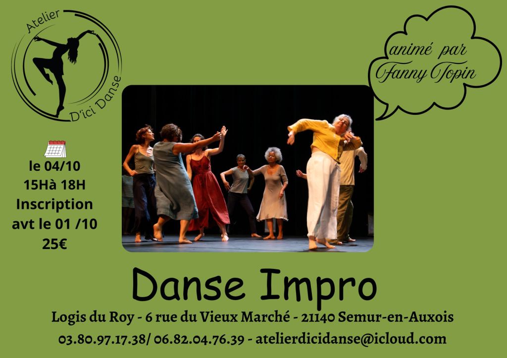 Danse improvisation samedi 4 octobre de 15h à 18h Partager : Cliquer pour partager sur X(ouvre dans une nouvelle fenêtre) X Cliquez pour partager sur Facebook(ouvre dans une nouvelle fenêtre) Facebook J’aime chargement… Similaire Laisser un commentaire Annuler la réponse. Δ